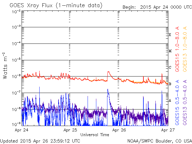 The operational data in the graph above has been modified to remove the scaling factor that has been applied by the Space Weather Prediction Center (SWPC). Because of the SWPC scaling factor in the operational data, flare indices for the operational data were reported as 42% smaller than for the science quality data. The scaling factor has also been removed from the solar flare list to reflect the true physical units.