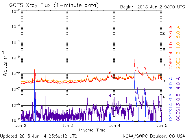 The operational data in the graph above has been modified to remove the scaling factor that has been applied by the Space Weather Prediction Center (SWPC). Because of the SWPC scaling factor in the operational data, flare indices for the operational data were reported as 42% smaller than for the science quality data. The scaling factor has also been removed from the solar flare list to reflect the true physical units.