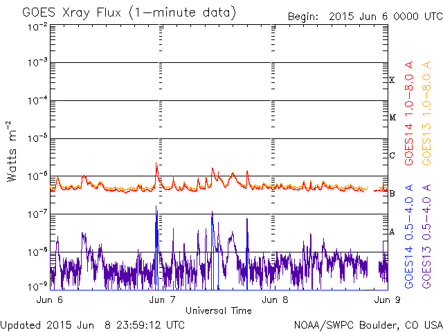 The operational data in the graph above has been modified to remove the scaling factor that has been applied by the Space Weather Prediction Center (SWPC). Because of the SWPC scaling factor in the operational data, flare indices for the operational data were reported as 42% smaller than for the science quality data. The scaling factor has also been removed from the solar flare list to reflect the true physical units.