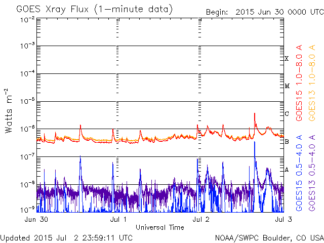 The operational data in the graph above has been modified to remove the scaling factor that has been applied by the Space Weather Prediction Center (SWPC). Because of the SWPC scaling factor in the operational data, flare indices for the operational data were reported as 42% smaller than for the science quality data. The scaling factor has also been removed from the solar flare list to reflect the true physical units.