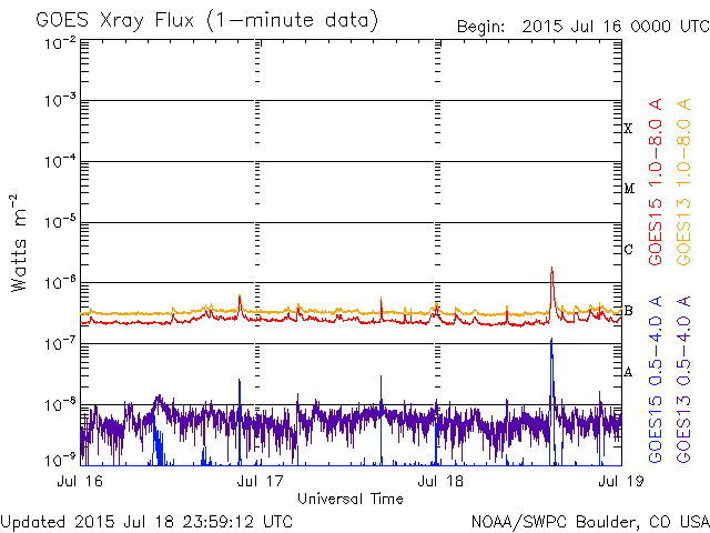 The operational data in the graph above has been modified to remove the scaling factor that has been applied by the Space Weather Prediction Center (SWPC). Because of the SWPC scaling factor in the operational data, flare indices for the operational data were reported as 42% smaller than for the science quality data. The scaling factor has also been removed from the solar flare list to reflect the true physical units.