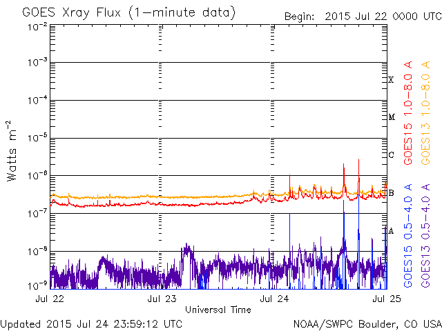 The operational data in the graph above has been modified to remove the scaling factor that has been applied by the Space Weather Prediction Center (SWPC). Because of the SWPC scaling factor in the operational data, flare indices for the operational data were reported as 42% smaller than for the science quality data. The scaling factor has also been removed from the solar flare list to reflect the true physical units.