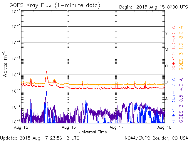 The operational data in the graph above has been modified to remove the scaling factor that has been applied by the Space Weather Prediction Center (SWPC). Because of the SWPC scaling factor in the operational data, flare indices for the operational data were reported as 42% smaller than for the science quality data. The scaling factor has also been removed from the solar flare list to reflect the true physical units.