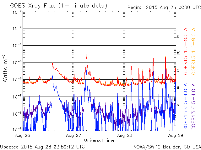 The operational data in the graph above has been modified to remove the scaling factor that has been applied by the Space Weather Prediction Center (SWPC). Because of the SWPC scaling factor in the operational data, flare indices for the operational data were reported as 42% smaller than for the science quality data. The scaling factor has also been removed from the solar flare list to reflect the true physical units.
