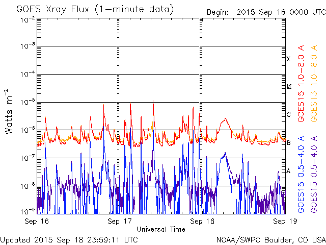 The operational data in the graph above has been modified to remove the scaling factor that has been applied by the Space Weather Prediction Center (SWPC). Because of the SWPC scaling factor in the operational data, flare indices for the operational data were reported as 42% smaller than for the science quality data. The scaling factor has also been removed from the solar flare list to reflect the true physical units.
