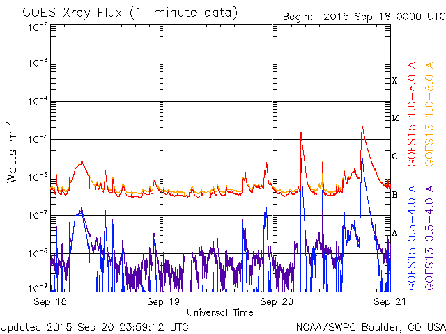 The operational data in the graph above has been modified to remove the scaling factor that has been applied by the Space Weather Prediction Center (SWPC). Because of the SWPC scaling factor in the operational data, flare indices for the operational data were reported as 42% smaller than for the science quality data. The scaling factor has also been removed from the solar flare list to reflect the true physical units.