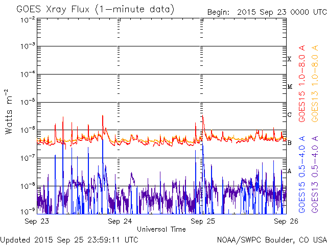 The operational data in the graph above has been modified to remove the scaling factor that has been applied by the Space Weather Prediction Center (SWPC). Because of the SWPC scaling factor in the operational data, flare indices for the operational data were reported as 42% smaller than for the science quality data. The scaling factor has also been removed from the solar flare list to reflect the true physical units.