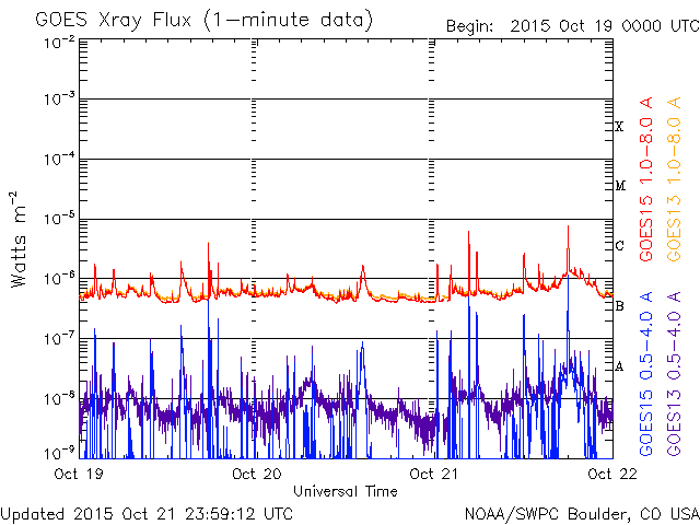 The operational data in the graph above has been modified to remove the scaling factor that has been applied by the Space Weather Prediction Center (SWPC). Because of the SWPC scaling factor in the operational data, flare indices for the operational data were reported as 42% smaller than for the science quality data. The scaling factor has also been removed from the solar flare list to reflect the true physical units.