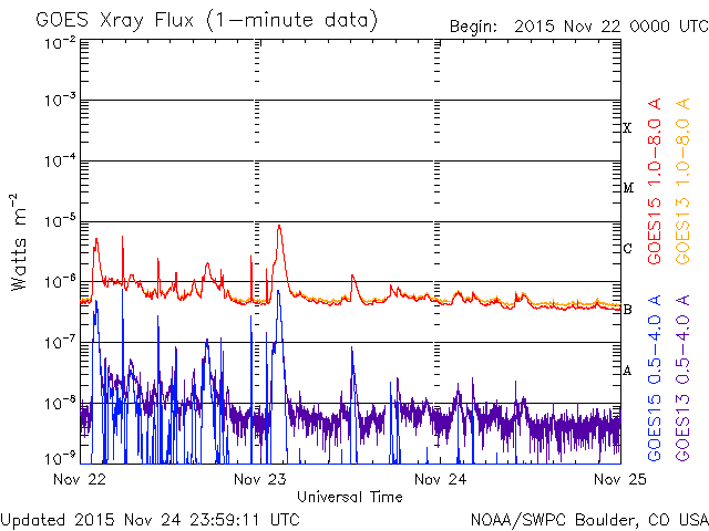 The operational data in the graph above has been modified to remove the scaling factor that has been applied by the Space Weather Prediction Center (SWPC). Because of the SWPC scaling factor in the operational data, flare indices for the operational data were reported as 42% smaller than for the science quality data. The scaling factor has also been removed from the solar flare list to reflect the true physical units.