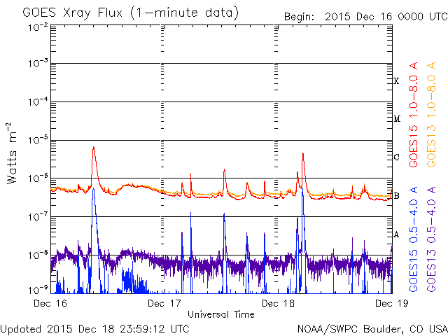 The operational data in the graph above has been modified to remove the scaling factor that has been applied by the Space Weather Prediction Center (SWPC). Because of the SWPC scaling factor in the operational data, flare indices for the operational data were reported as 42% smaller than for the science quality data. The scaling factor has also been removed from the solar flare list to reflect the true physical units.