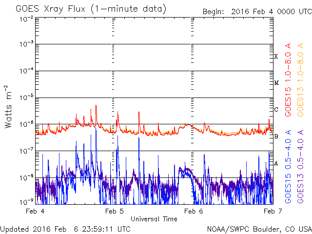 The operational data in the graph above has been modified to remove the scaling factor that has been applied by the Space Weather Prediction Center (SWPC). Because of the SWPC scaling factor in the operational data, flare indices for the operational data were reported as 42% smaller than for the science quality data. The scaling factor has also been removed from the solar flare list to reflect the true physical units.