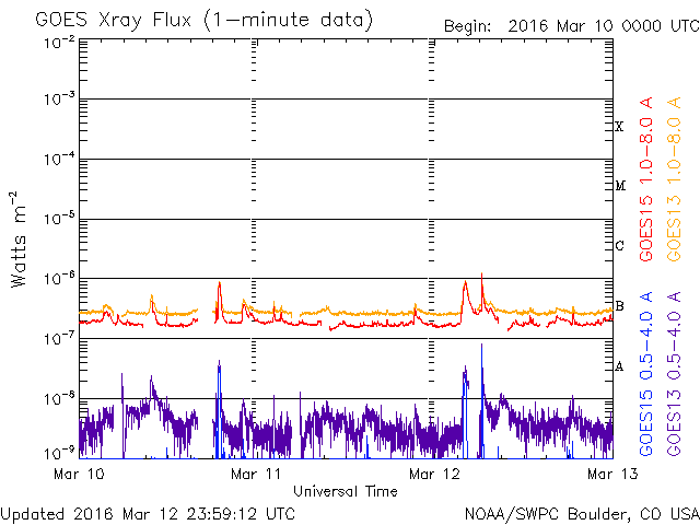 The operational data in the graph above has been modified to remove the scaling factor that has been applied by the Space Weather Prediction Center (SWPC). Because of the SWPC scaling factor in the operational data, flare indices for the operational data were reported as 42% smaller than for the science quality data. The scaling factor has also been removed from the solar flare list to reflect the true physical units.
