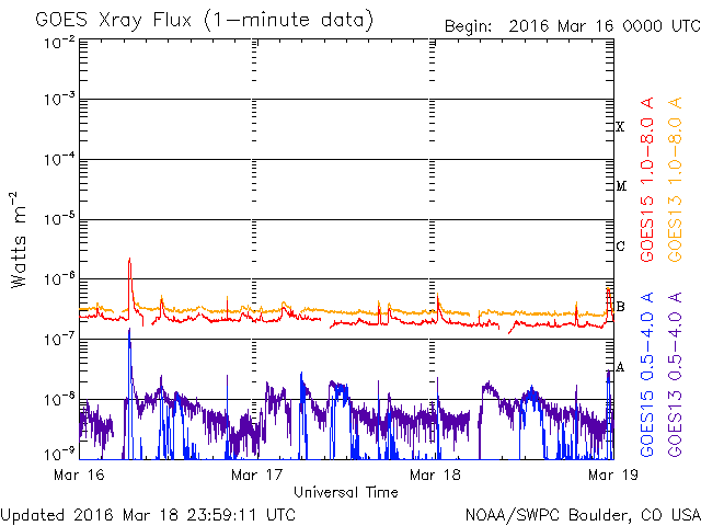 The operational data in the graph above has been modified to remove the scaling factor that has been applied by the Space Weather Prediction Center (SWPC). Because of the SWPC scaling factor in the operational data, flare indices for the operational data were reported as 42% smaller than for the science quality data. The scaling factor has also been removed from the solar flare list to reflect the true physical units.
