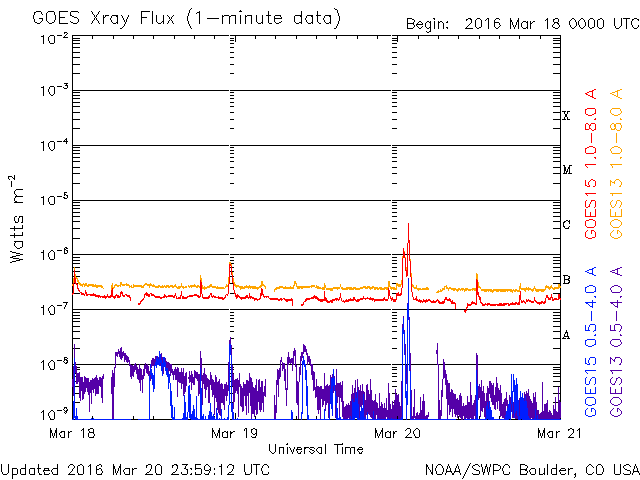 The operational data in the graph above has been modified to remove the scaling factor that has been applied by the Space Weather Prediction Center (SWPC). Because of the SWPC scaling factor in the operational data, flare indices for the operational data were reported as 42% smaller than for the science quality data. The scaling factor has also been removed from the solar flare list to reflect the true physical units.