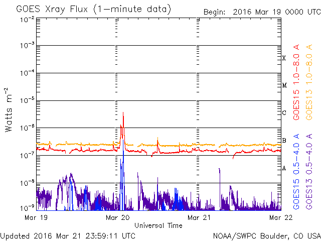 The operational data in the graph above has been modified to remove the scaling factor that has been applied by the Space Weather Prediction Center (SWPC). Because of the SWPC scaling factor in the operational data, flare indices for the operational data were reported as 42% smaller than for the science quality data. The scaling factor has also been removed from the solar flare list to reflect the true physical units.