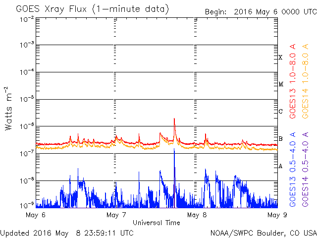 The operational data in the graph above has been modified to remove the scaling factor that has been applied by the Space Weather Prediction Center (SWPC). Because of the SWPC scaling factor in the operational data, flare indices for the operational data were reported as 42% smaller than for the science quality data. The scaling factor has also been removed from the solar flare list to reflect the true physical units.