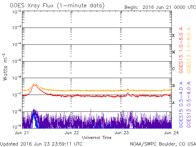 The operational data in the graph above has been modified to remove the scaling factor that has been applied by the Space Weather Prediction Center (SWPC). Because of the SWPC scaling factor in the operational data, flare indices for the operational data were reported as 42% smaller than for the science quality data. The scaling factor has also been removed from the solar flare list to reflect the true physical units.