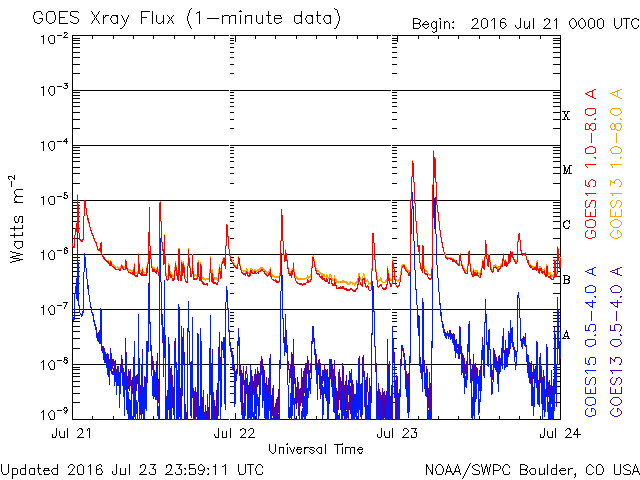 The operational data in the graph above has been modified to remove the scaling factor that has been applied by the Space Weather Prediction Center (SWPC). Because of the SWPC scaling factor in the operational data, flare indices for the operational data were reported as 42% smaller than for the science quality data. The scaling factor has also been removed from the solar flare list to reflect the true physical units.