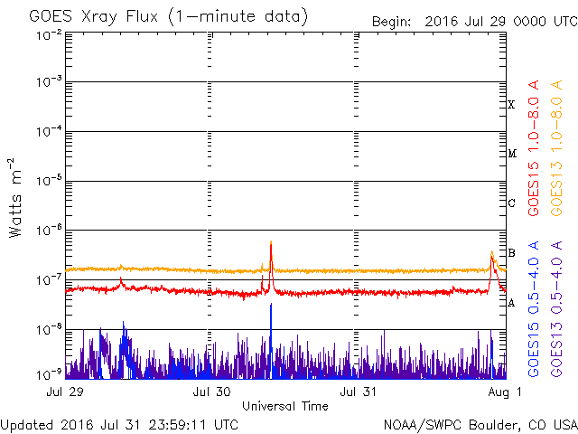 The operational data in the graph above has been modified to remove the scaling factor that has been applied by the Space Weather Prediction Center (SWPC). Because of the SWPC scaling factor in the operational data, flare indices for the operational data were reported as 42% smaller than for the science quality data. The scaling factor has also been removed from the solar flare list to reflect the true physical units.