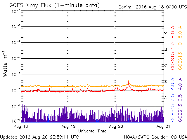 The operational data in the graph above has been modified to remove the scaling factor that has been applied by the Space Weather Prediction Center (SWPC). Because of the SWPC scaling factor in the operational data, flare indices for the operational data were reported as 42% smaller than for the science quality data. The scaling factor has also been removed from the solar flare list to reflect the true physical units.