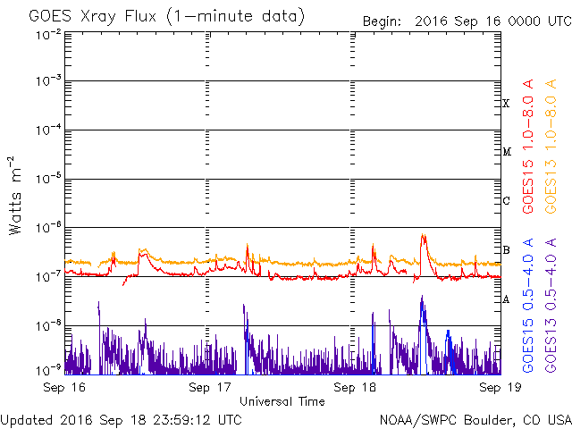 The operational data in the graph above has been modified to remove the scaling factor that has been applied by the Space Weather Prediction Center (SWPC). Because of the SWPC scaling factor in the operational data, flare indices for the operational data were reported as 42% smaller than for the science quality data. The scaling factor has also been removed from the solar flare list to reflect the true physical units.