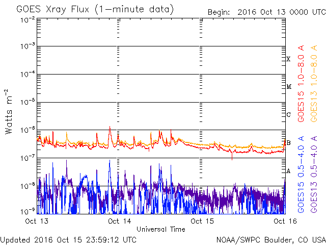 The operational data in the graph above has been modified to remove the scaling factor that has been applied by the Space Weather Prediction Center (SWPC). Because of the SWPC scaling factor in the operational data, flare indices for the operational data were reported as 42% smaller than for the science quality data. The scaling factor has also been removed from the solar flare list to reflect the true physical units.