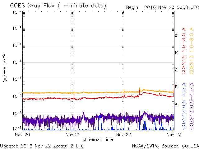 The operational data in the graph above has been modified to remove the scaling factor that has been applied by the Space Weather Prediction Center (SWPC). Because of the SWPC scaling factor in the operational data, flare indices for the operational data were reported as 42% smaller than for the science quality data. The scaling factor has also been removed from the solar flare list to reflect the true physical units.