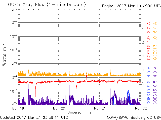 The operational data in the graph above has been modified to remove the scaling factor that has been applied by the Space Weather Prediction Center (SWPC). Because of the SWPC scaling factor in the operational data, flare indices for the operational data were reported as 42% smaller than for the science quality data. The scaling factor has also been removed from the solar flare list to reflect the true physical units.