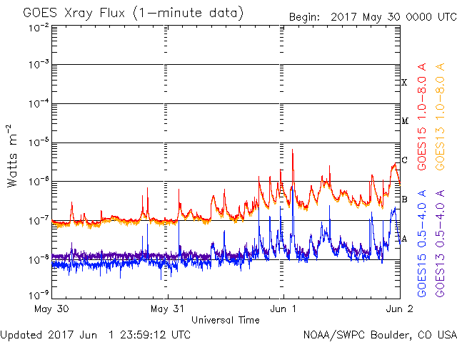 The operational data in the graph above has been modified to remove the scaling factor that has been applied by the Space Weather Prediction Center (SWPC). Because of the SWPC scaling factor in the operational data, flare indices for the operational data were reported as 42% smaller than for the science quality data. The scaling factor has also been removed from the solar flare list to reflect the true physical units.