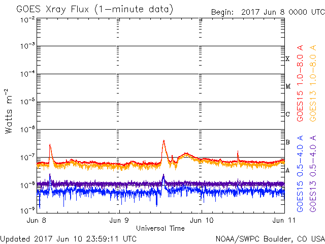 The operational data in the graph above has been modified to remove the scaling factor that has been applied by the Space Weather Prediction Center (SWPC). Because of the SWPC scaling factor in the operational data, flare indices for the operational data were reported as 42% smaller than for the science quality data. The scaling factor has also been removed from the solar flare list to reflect the true physical units.