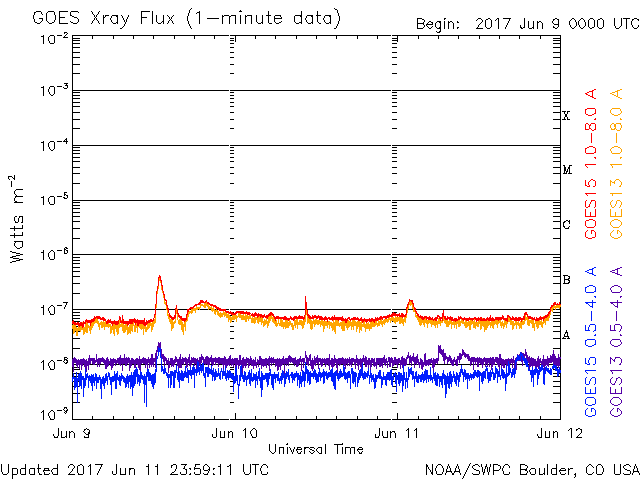 The operational data in the graph above has been modified to remove the scaling factor that has been applied by the Space Weather Prediction Center (SWPC). Because of the SWPC scaling factor in the operational data, flare indices for the operational data were reported as 42% smaller than for the science quality data. The scaling factor has also been removed from the solar flare list to reflect the true physical units.