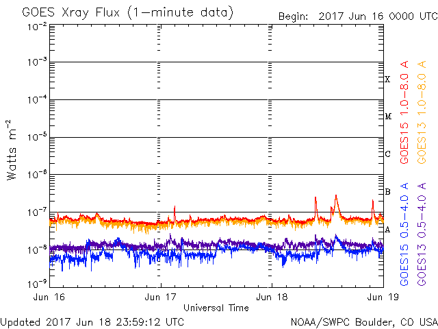 The operational data in the graph above has been modified to remove the scaling factor that has been applied by the Space Weather Prediction Center (SWPC). Because of the SWPC scaling factor in the operational data, flare indices for the operational data were reported as 42% smaller than for the science quality data. The scaling factor has also been removed from the solar flare list to reflect the true physical units.