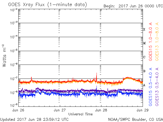 The operational data in the graph above has been modified to remove the scaling factor that has been applied by the Space Weather Prediction Center (SWPC). Because of the SWPC scaling factor in the operational data, flare indices for the operational data were reported as 42% smaller than for the science quality data. The scaling factor has also been removed from the solar flare list to reflect the true physical units.