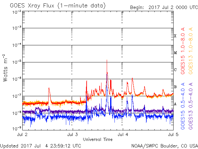 The operational data in the graph above has been modified to remove the scaling factor that has been applied by the Space Weather Prediction Center (SWPC). Because of the SWPC scaling factor in the operational data, flare indices for the operational data were reported as 42% smaller than for the science quality data. The scaling factor has also been removed from the solar flare list to reflect the true physical units.