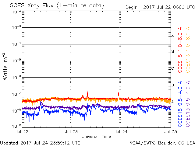 The operational data in the graph above has been modified to remove the scaling factor that has been applied by the Space Weather Prediction Center (SWPC). Because of the SWPC scaling factor in the operational data, flare indices for the operational data were reported as 42% smaller than for the science quality data. The scaling factor has also been removed from the solar flare list to reflect the true physical units.