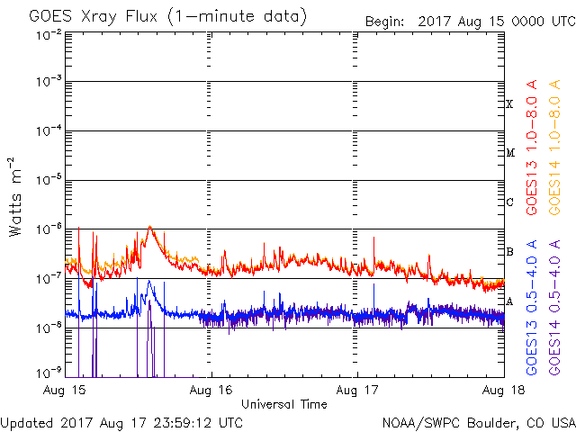 The operational data in the graph above has been modified to remove the scaling factor that has been applied by the Space Weather Prediction Center (SWPC). Because of the SWPC scaling factor in the operational data, flare indices for the operational data were reported as 42% smaller than for the science quality data. The scaling factor has also been removed from the solar flare list to reflect the true physical units.