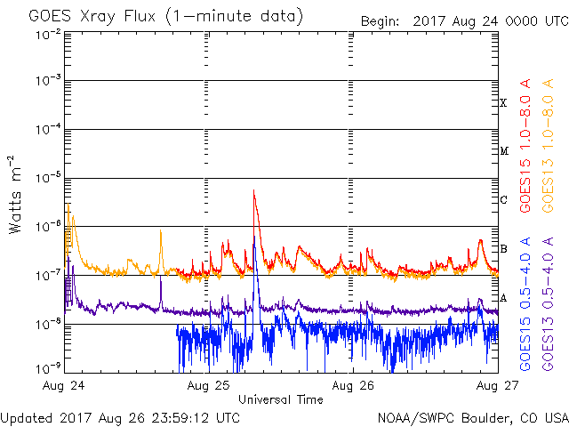 The operational data in the graph above has been modified to remove the scaling factor that has been applied by the Space Weather Prediction Center (SWPC). Because of the SWPC scaling factor in the operational data, flare indices for the operational data were reported as 42% smaller than for the science quality data. The scaling factor has also been removed from the solar flare list to reflect the true physical units.
