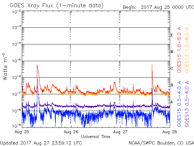 The operational data in the graph above has been modified to remove the scaling factor that has been applied by the Space Weather Prediction Center (SWPC). Because of the SWPC scaling factor in the operational data, flare indices for the operational data were reported as 42% smaller than for the science quality data. The scaling factor has also been removed from the solar flare list to reflect the true physical units.