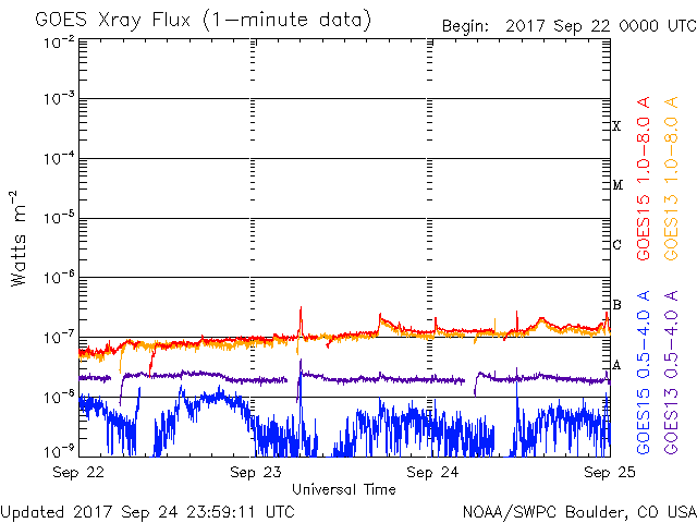 The operational data in the graph above has been modified to remove the scaling factor that has been applied by the Space Weather Prediction Center (SWPC). Because of the SWPC scaling factor in the operational data, flare indices for the operational data were reported as 42% smaller than for the science quality data. The scaling factor has also been removed from the solar flare list to reflect the true physical units.