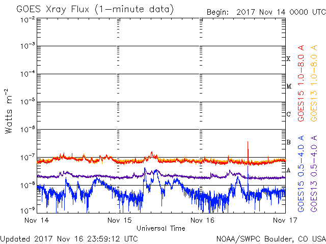 The operational data in the graph above has been modified to remove the scaling factor that has been applied by the Space Weather Prediction Center (SWPC). Because of the SWPC scaling factor in the operational data, flare indices for the operational data were reported as 42% smaller than for the science quality data. The scaling factor has also been removed from the solar flare list to reflect the true physical units.