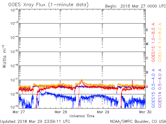 The operational data in the graph above has been modified to remove the scaling factor that has been applied by the Space Weather Prediction Center (SWPC). Because of the SWPC scaling factor in the operational data, flare indices for the operational data were reported as 42% smaller than for the science quality data. The scaling factor has also been removed from the solar flare list to reflect the true physical units.