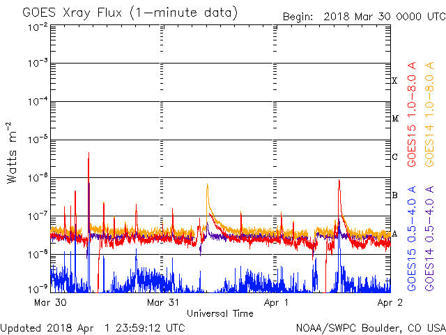 The operational data in the graph above has been modified to remove the scaling factor that has been applied by the Space Weather Prediction Center (SWPC). Because of the SWPC scaling factor in the operational data, flare indices for the operational data were reported as 42% smaller than for the science quality data. The scaling factor has also been removed from the solar flare list to reflect the true physical units.