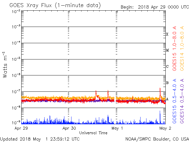 The operational data in the graph above has been modified to remove the scaling factor that has been applied by the Space Weather Prediction Center (SWPC). Because of the SWPC scaling factor in the operational data, flare indices for the operational data were reported as 42% smaller than for the science quality data. The scaling factor has also been removed from the solar flare list to reflect the true physical units.
