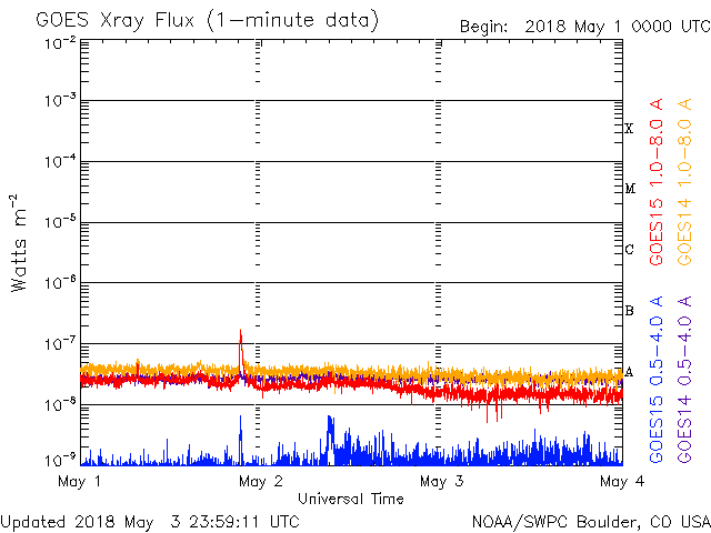 The operational data in the graph above has been modified to remove the scaling factor that has been applied by the Space Weather Prediction Center (SWPC). Because of the SWPC scaling factor in the operational data, flare indices for the operational data were reported as 42% smaller than for the science quality data. The scaling factor has also been removed from the solar flare list to reflect the true physical units.