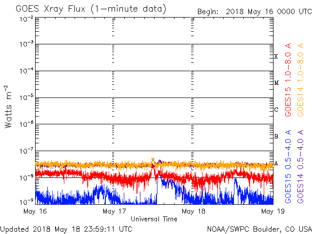 The operational data in the graph above has been modified to remove the scaling factor that has been applied by the Space Weather Prediction Center (SWPC). Because of the SWPC scaling factor in the operational data, flare indices for the operational data were reported as 42% smaller than for the science quality data. The scaling factor has also been removed from the solar flare list to reflect the true physical units.