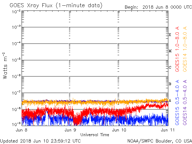 The operational data in the graph above has been modified to remove the scaling factor that has been applied by the Space Weather Prediction Center (SWPC). Because of the SWPC scaling factor in the operational data, flare indices for the operational data were reported as 42% smaller than for the science quality data. The scaling factor has also been removed from the solar flare list to reflect the true physical units.