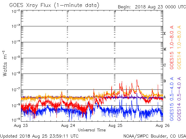 The operational data in the graph above has been modified to remove the scaling factor that has been applied by the Space Weather Prediction Center (SWPC). Because of the SWPC scaling factor in the operational data, flare indices for the operational data were reported as 42% smaller than for the science quality data. The scaling factor has also been removed from the solar flare list to reflect the true physical units.