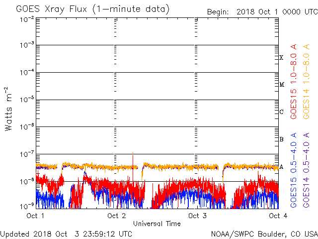 The operational data in the graph above has been modified to remove the scaling factor that has been applied by the Space Weather Prediction Center (SWPC). Because of the SWPC scaling factor in the operational data, flare indices for the operational data were reported as 42% smaller than for the science quality data. The scaling factor has also been removed from the solar flare list to reflect the true physical units.