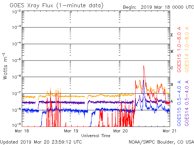 The operational data in the graph above has been modified to remove the scaling factor that has been applied by the Space Weather Prediction Center (SWPC). Because of the SWPC scaling factor in the operational data, flare indices for the operational data were reported as 42% smaller than for the science quality data. The scaling factor has also been removed from the solar flare list to reflect the true physical units.