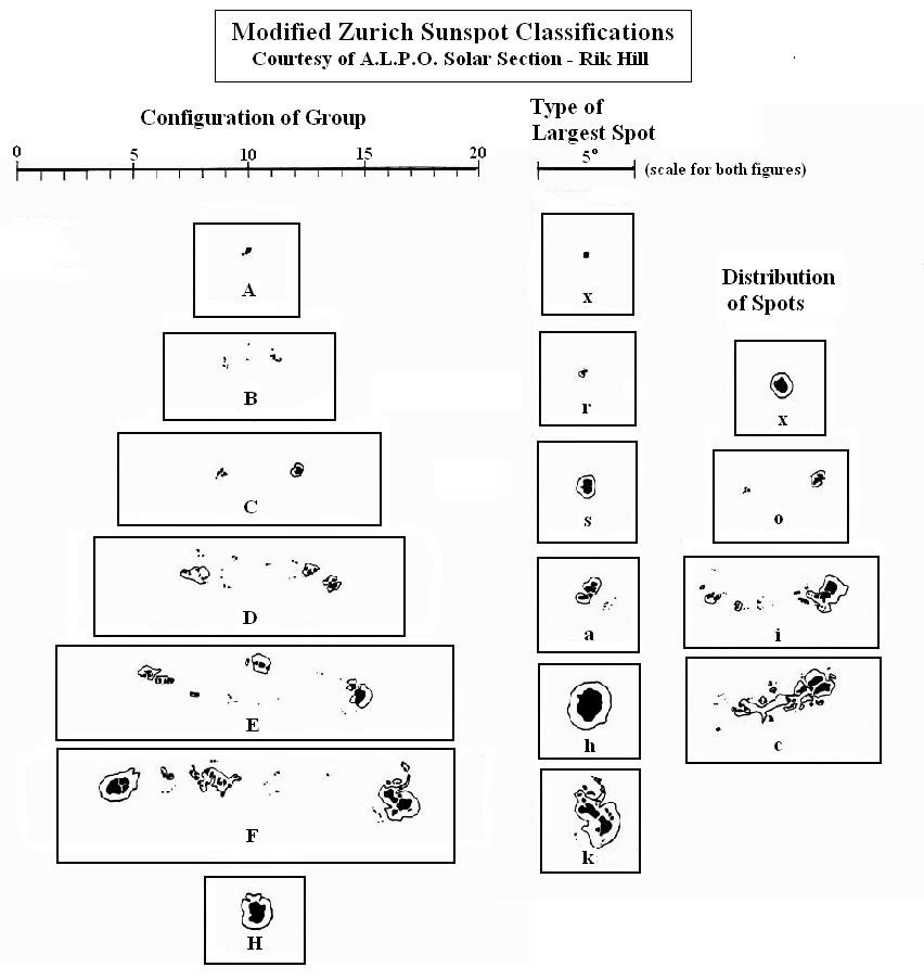 The sunspots on the earth-facing side of the Sun are counted every day by the space weather specialists and they give each sunspot region a magnetic classification and a spot classification. On our website you’ll find an overview of all the sunspot groups together with their classification. Below you get to know what these mean.